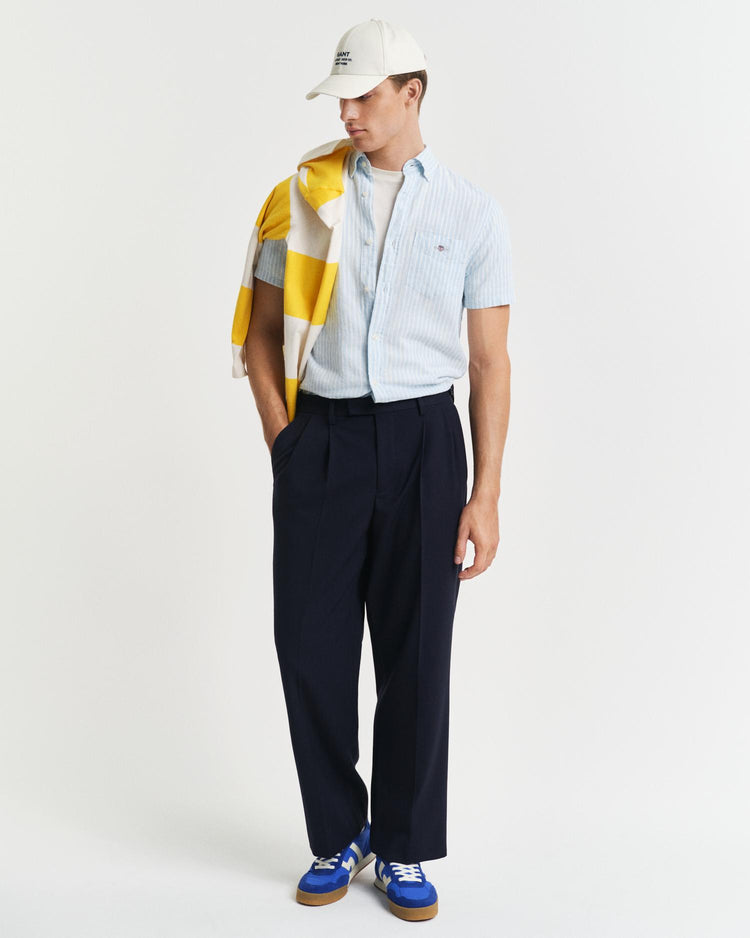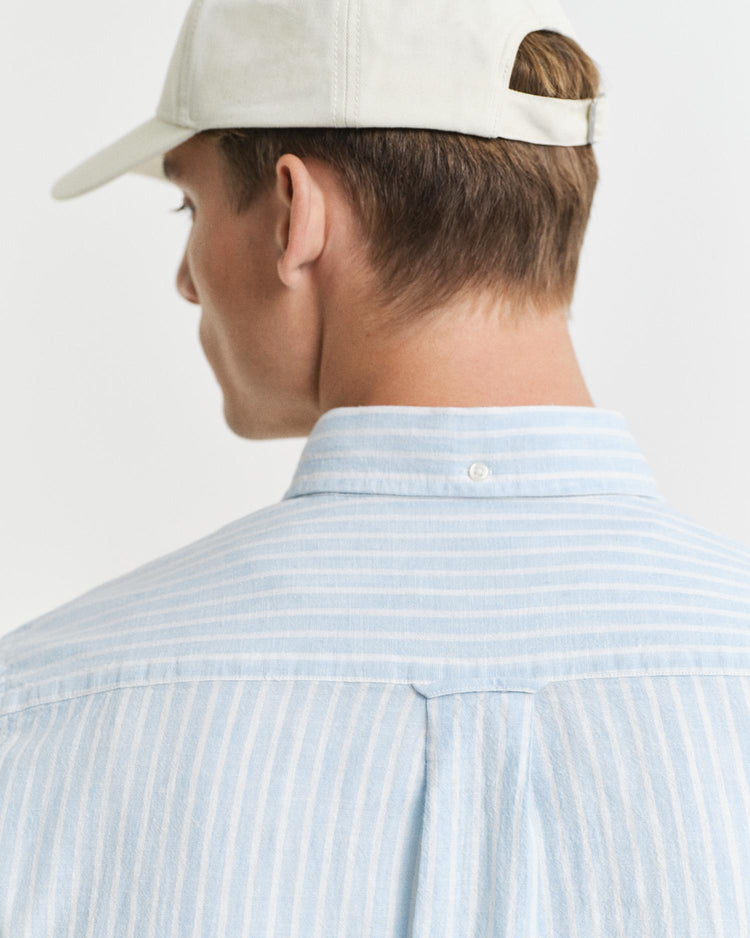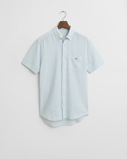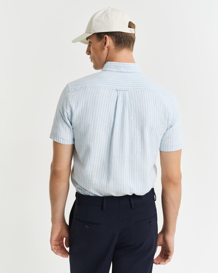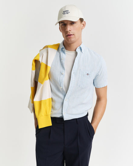 Made of a crisp linen-cotton blend, this shirt is light, breathable and airy. Cut for a regular fit, it is designed with short sleeves for the warmer, summer months. Patterned with yarn-dyed stripes, it has a button-down collar, curved hem, a chest pocket with brand embroidery and a box pleat and locker loop at the back.