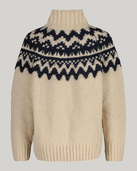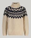Featuring a traditional Fair Isle intarsia pattern, this sweater is crafted from a blended lambswool boucle yarn. A cozy winter piece that's perfect for the holiday season, this sweater includes a turtleneck, raglan sleeves and ribbed detailing. This garment is intended for an oversized fit. For a closer fit, we recommend sizing down.